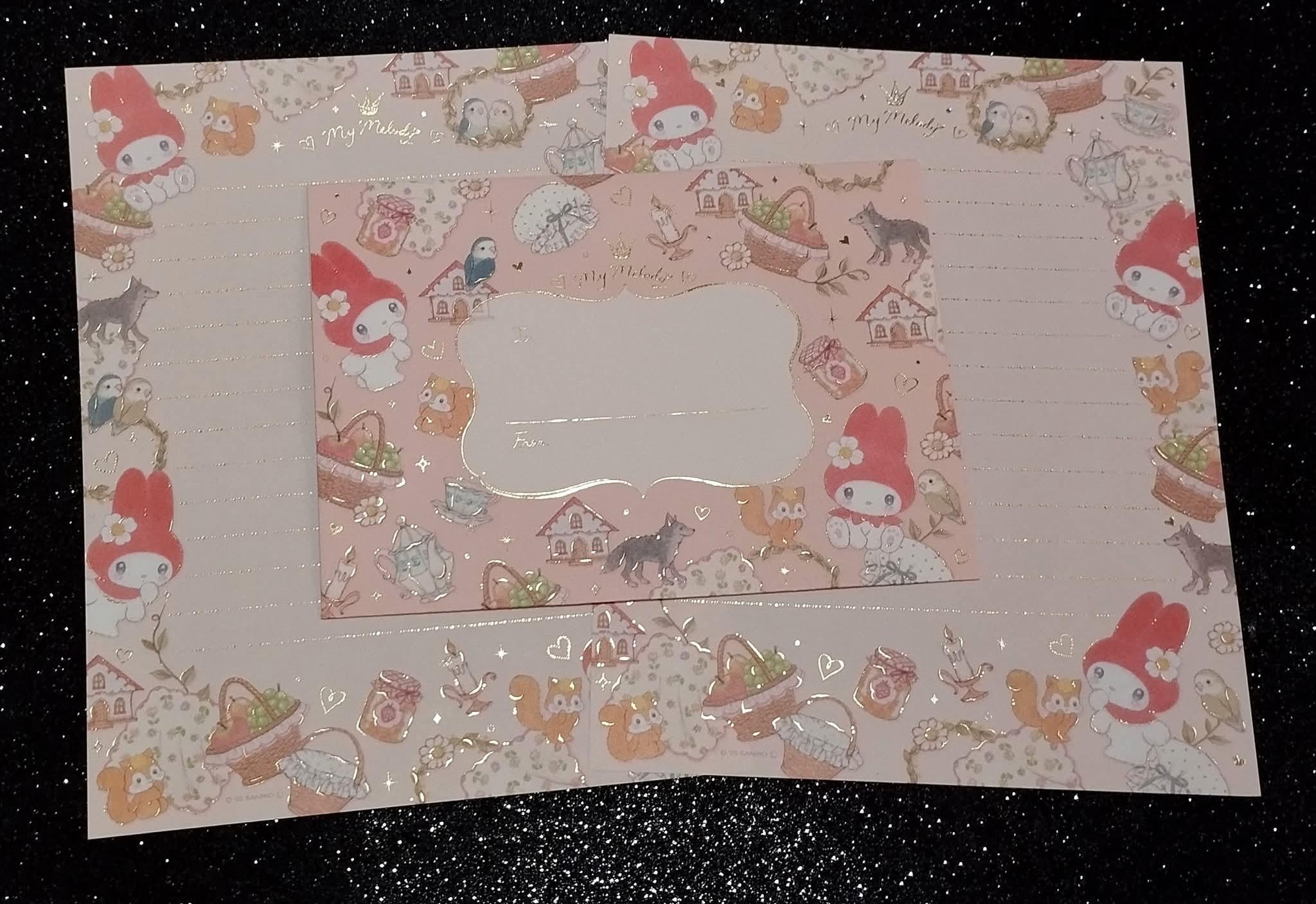 Papel de Carta da Sanrio Japão, da My Melody, do ano de 2025. Coleção Amenomori Fumika. Detalhes em dourado